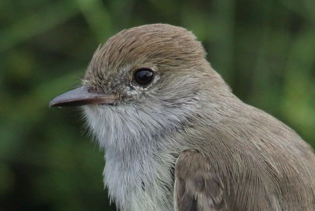 Un poco mas arriba se acababa la zona humanizada y por tanto la pista y se entraba al parque nacional así que nos bajamos del coche y empezamos el pateo bajo la garúa que afortunadamente para mi solo me acompañó los primeros dias, no por mojarme sino porque con esa niebla persistente resulta imposible hacer fotos. Al poquito una preciosa hembra de Mosquero cardenal se dejó también fotografiar sin problema y un poco después la garúa dejó paso a un solecito que hizo mas agradable el pateo.