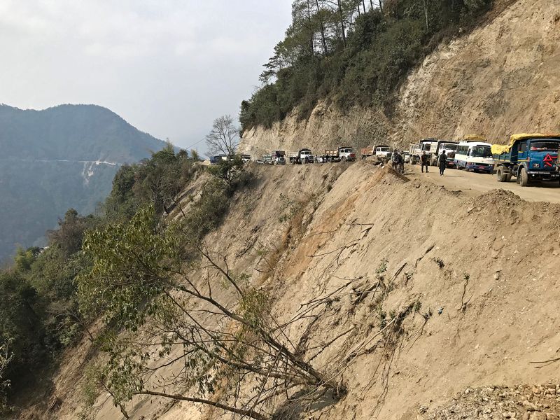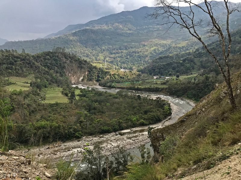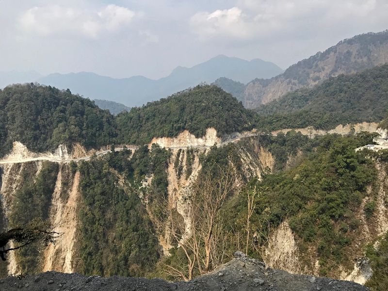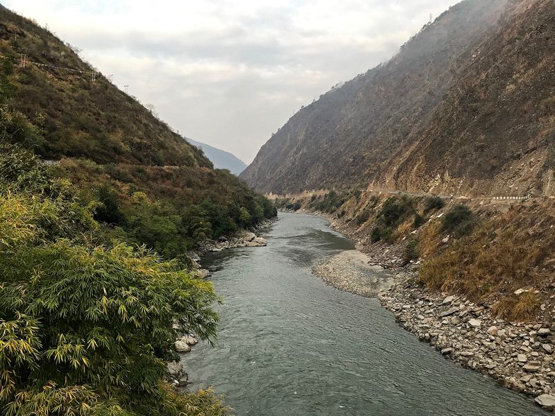 Se puede ver la carretera zigzagueando en ambas laderas y un río al fondo en este caso el Mangde Chu