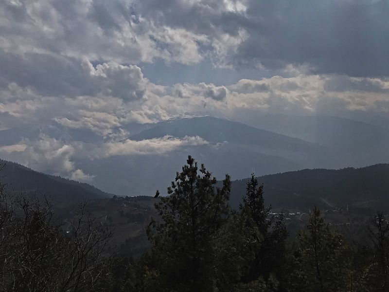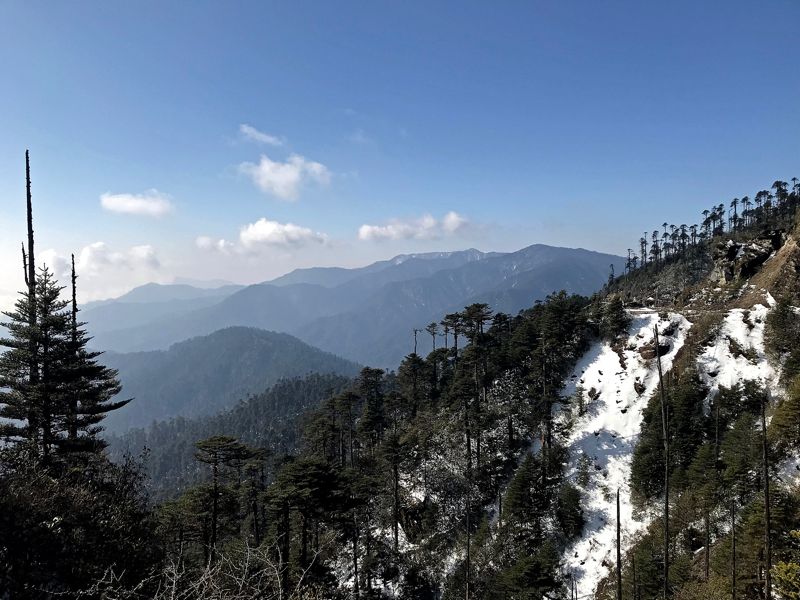 Y es que Bután son todo montañas y valles. Para ir a cualquier sitio hay que ir subiendo en zigzag por una montaña, coronarla, bajarla haciendo otro zigzag, pasar el correspondiente río que atraviesa el valle y volver a subir para repetir la historia.