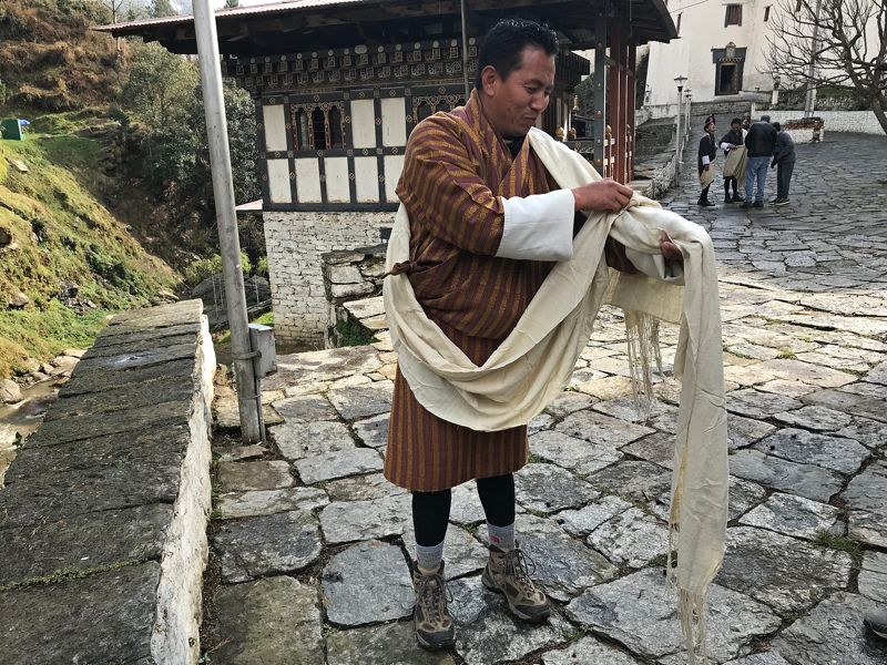 Aquí Jigme nos explica como se envuelve en el pañuelo blanco de tres metros que forma parte de la vestimenta
