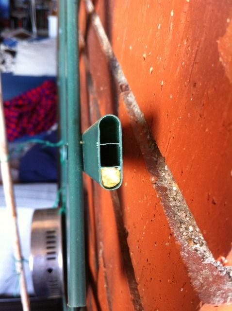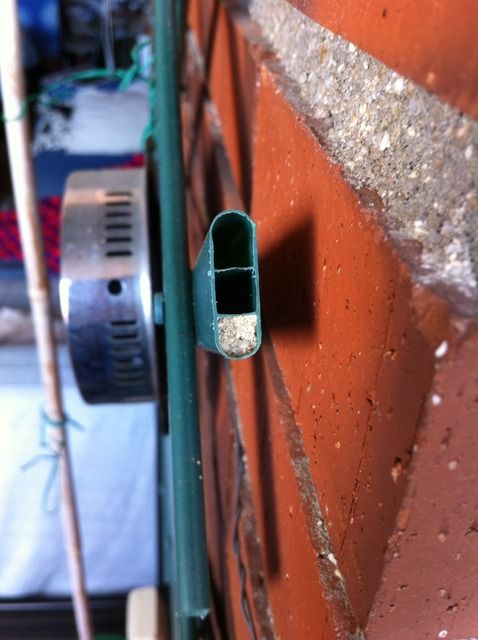 Pero también las abejas han llegado. Esta pequeña ha sido la primera en dejar sus ¿huevos? con su ración de polen y su correspondiente tapia, ahora vista desde dentro. :B1 El tubo es del tamaño pequeño (4 mm de diámetro)